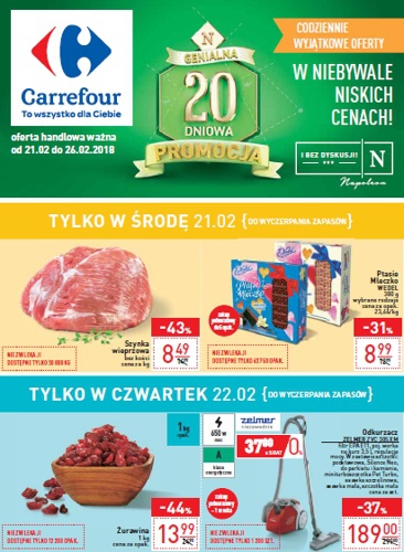 {loadposition linkCarrefour} 'Genialna 20-dniowa promocja to codziennie wyjątkowe oferty w niebywale niskich cenach!' - nowa gazetka promocyjna sieci sklepów Carrefour. Polecane promocje z gazetki Carrefour: Pomidory 1 kg - 4,49 zł. Ser żółty bez laktozy Valio 100…