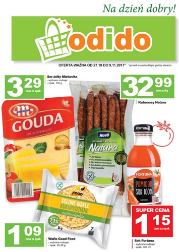 Nowa gazetka promocyjna sklepów Odido - "Na dzień dobry!". Polecane promocje z gazetki Odido: Ser żółty Mlekovita 150 g - 3,29 zł. Kabanosy Natura 1 kg - 32,99 zł. Sok pomidorowy Fortuna 300 ml - 1,15 zł.…