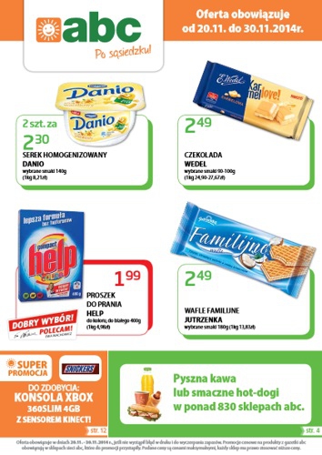 Nowa gazetka promocyjna sklepów ABC. Polecane promocje z gazetki ABC: Serek Danio 2x140 g - 2,30 zł. Czekolada Wedel 100 g - 2,49 zł. Proszek do prania Help 400 g - 1,99 zł. Oferta ważna od 20.11…