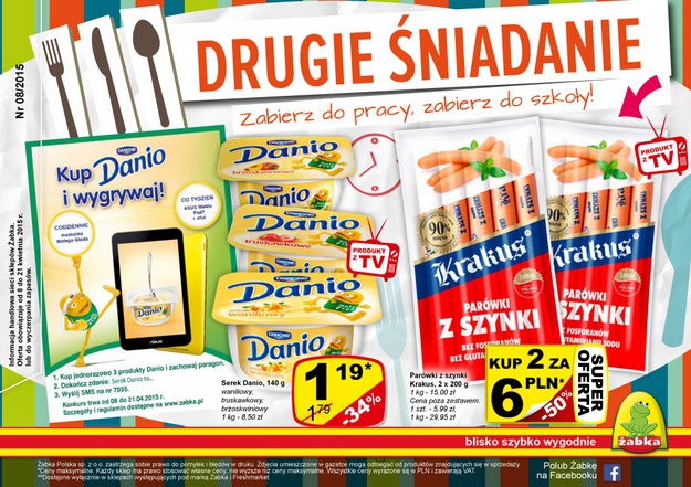 Nowa gazetka promocyjna sieci sklepów Żabka - "Drugie śniadanie - zabierz do pracy, zabierz do szkoły!". Polecane promocje z gazetki Żabka: Serek Danio 140 g - 1,19 zł. Parówki z szynki Krakus 2x200 g - 6 zł. Truskawki…