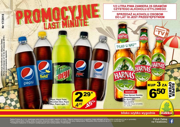 Nowa gazetka promocyjna sieci sklepów Żabka - "Promocyjne last minute". Polecane promocje z gazetki Żabka: Piwo Harnaś Rześkie Niepasteryzowane 3x500 ml - 6,50 zł. Serek Danio Danone 140 g - 1,39 zł. Kaszka mleczna Bobovita 230 g -…