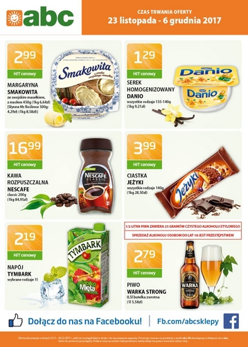 Nowa gazetka promocyjna sieci sklepów ABC. Polecane promocje z gazetki ABC: Margaryna Smakowita ze swojskim masełkiem 450 g - 2,99 zł. Serek homogenizowany Danio 140 g - 1,29 zł. Napój Tymbark 1 L - 2,19 zł. …