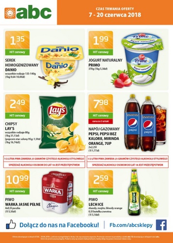 Nowa gazetka promocyjna sieci sklepów ABC. Polecane promocje z gazetki ABC: Serek homogenizowany Danio 140 g - 1,35 zł. Jogurt naturalny Zott Primo 370 g - 1,99 zł. Piwo Lech Ice 500 ml - 2,59 zł. …