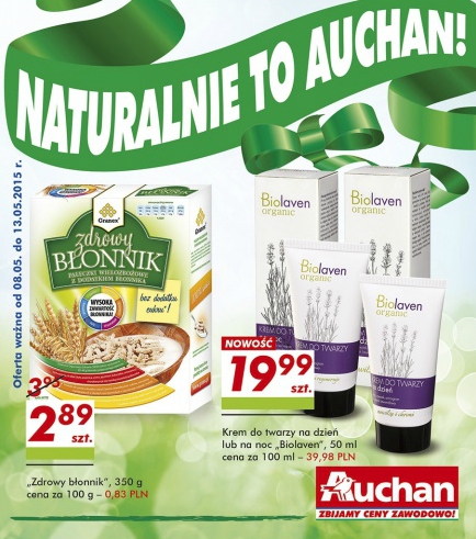 {loadposition linkAuchan} Nowa gazetka promocyjna Auchan - "Naturalnie to Auchan!". Polecane promocje z gazetki Auchan: Zdrowy błonnik 350 g - 2,89 zł. Krem do twarzy na dzień lub na noc Biolaven 50 ml - 19,99 zł. Serek homogenizowany EkoŁukta…