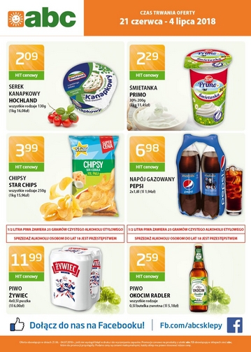 Nowa gazetka promocyjna sieci sklepów ABC. Polecane promocje z gazetki ABC: Serek kanapkowy Hochland 130 g - 2,09 zł. Śmietanka Zott Primo 200 g - 2,29 zł. Chipsy Star Chips 250 g - 3,99 zł. Oferta ważna…