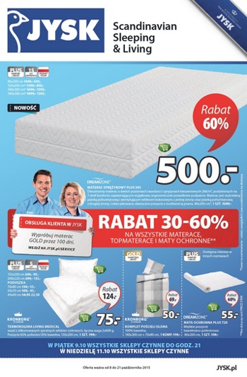 Nowa gazetka promocyjna JYSK. Polecane promocje z gazetki Jysk: Rabat 30-60% na wszystkie materace. Rabat 30-50% na serię WellPur. Rabat 20-40% na wszystkie regały. Oferta ważna od 8.10 do 21.10.