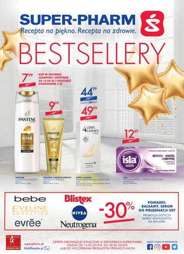 'Bestsellery' - nowa gazetka promocyjna Super-Pharm. Polecane promocje z gazetki Super-Pharm: Serum przyspieszające wzrost rzęs Long 4 Lashes 3 ml - 44,99 zł*. Pastylki na kaszel i chrypkę Isla 30 pastylek - 12,49 zł. Żel pod prysznic Nivea…
