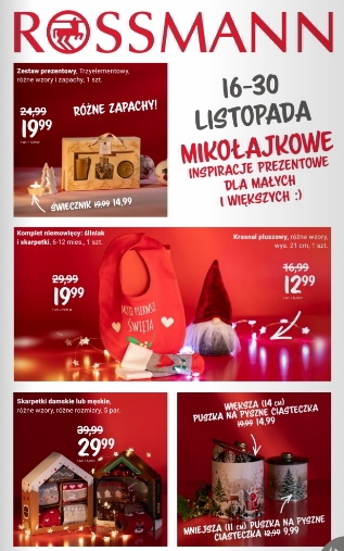 'Mikołajkowe inspiracje prezentowe dla małych i większych' - nowa gazetka promocyjna drogerii Rossmann. Polecane promocje z gazetki Rossmann: Krasnal pluszowy wys. 21 cm - 12,99 zł. Skarpetki damskie lub męskie 5 par - 29,99 zł. Woda perfumowana dla kobiet…
