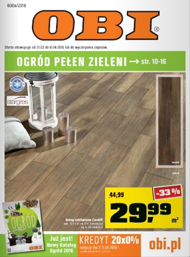 {loadposition linkObi} Nowa gazetka promocyjna Obi. Polecane promocje z gazetki Obi: Skrzydło drzwiowe Avilla - 89,99 zł. Kabina prysznicowa Mars z brodzikiem - 399 zł. Ekogroszek 20 kg - 12,99 zł. Zobacz także: Katalog Obi Dekoracje 2014. …
