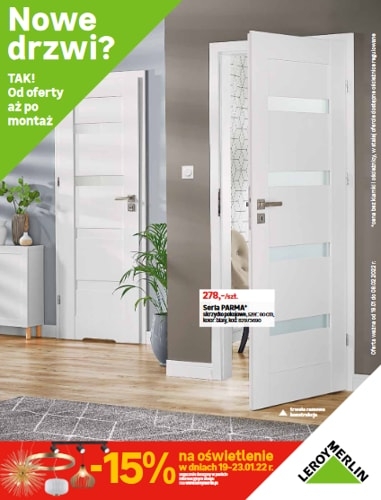 'Nowe drzwi? TAK! Od oferty aż po montaż' - nowa gazetka promocyjna Leroy Merlin. Polecane promocje z gazetki Leroy Merlin: Skrzydło pokojowe Parma - 278 zł. Skrzydło pełne Trim - 237 zł. Skrzydło pokojowe Simon dąb sonoma - 227…