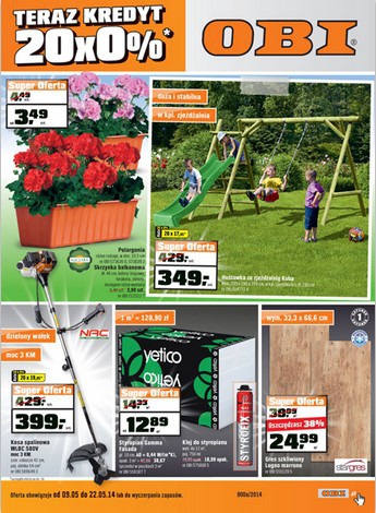 {loadposition linkObi} Nowa gazetka promocyjna Obi - "Teraz kredyt 20x0%". Polecane promocje z gazetki Obi: Skrzynka balkonowa - 3,99 zł. Huśtawka ze zjeżdżalnią Kuba - 349 zł. Kosa spalinowa WLBC 580V moc 3KM - 399 zł. Zobacz także:…