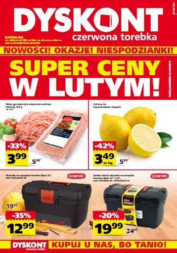 Nowy katalog sieci handlowej Czerwona Torebka - "Super ceny w lutym!". Polecane promocje z katalogu sieci Czerwona Torebka: Mięso garmażeryjne wieprzowo-wołowe Olewnik 450 g - 3,99 zł. Cytryny 1 kg - 3,49 zł. Skrzynka na narzędzia Herobox Basic…