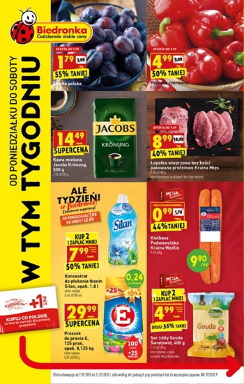 {loadposition linkBiedronka1} 'Ale tydzień! Biedronkowe oszczędności od poniedziałku do soboty' - nowa gazetka promocyjna sieci sklepów Biedronka. Polecane promocje z gazetki sieci Biedronka: Śliwka polska 1 kg - 1,99 zł*. Mięso mielone z łopatki wieprzowej Kraina Mięs 3x500 g…