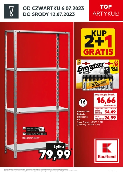 {loadposition linkKaufland4} 'Top Artykuł!' - nowa gazetka promocyjna sieci marketów Kaufland. Polecane promocje z gazetki Kaufland: Regał metalowy 150x75x30 cm - 79,99 zł. Baterie alkaliczne AA Energizer 16 sztuk - 16,66 zł*. Słoik do ogórków poj. 4 L -…