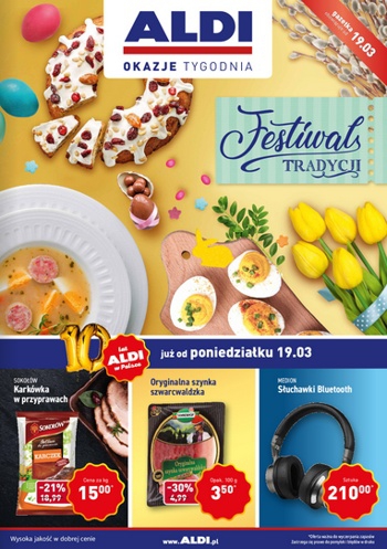 {loadposition linkAldi} 'Festiwal tradycji' - nowa gazetka promocyjna Aldi. Polecane promocje z gazetki Aldi: Karkówka w przyprawach Sokołów 1 kg - 15 zł. Oryginalna szynka szwarcwaldzka 100 g - 3,50 zł. Słuchawki Bluetooth Medion - 210 zł. …