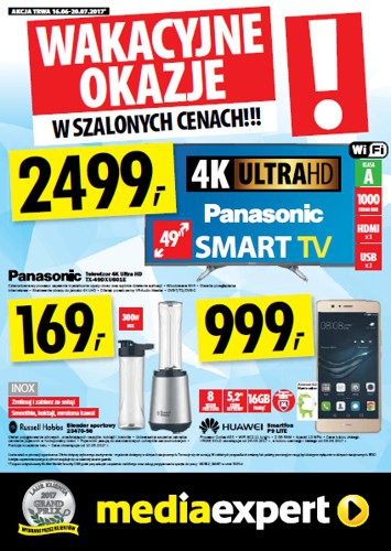 {loadposition linkMediaExpert} Nowa gazetka promocyjna Media Expert - "Wakacyjne okazje w szalonych cenach!". Polecane promocje z gazetki Media Expert: Telewizor 4K Ultra HD 49 cali Panasonic TX-49DXU601E - 2499 zł. Blender sportowy Russel Hobbs 23470-56 - 169 zł. Smartfon…