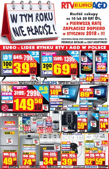 Nowa gazetka promocyjna RTV EURO AGD - 'W tym roku nie płacisz!'. Polecane promocje z gazetki RTV EURO AGD: Telewizor LED 32 cale Thomson 32HC3101 - 799 zł. Smartfon Huawei P9 Lite 2017 - 999 zł. Laptop HP Pavilion…