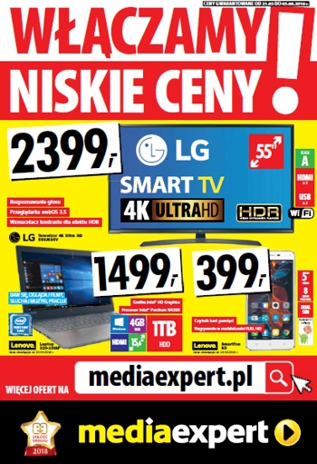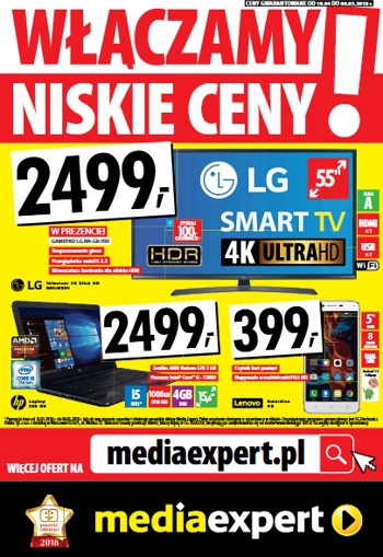 {loadposition linkMediaExpert} 'Włączamy niskie ceny' - nowa gazetka promocyjna sieci sklepów Media Expert. Polecane promocje z gazetki Media Expert: Telewizor 4K Ultra HD 55 cali LG 55UJ635V - 2499 zł. Laptop HP 250 G6 - 2499 zł. Smartfon LENOVO…