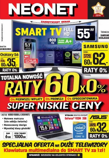 {loadposition linkNeonet} Nowa gazetka promocyjna Neonet - "Super niskie ceny". Polecane promocje z gazetki Neonet: Smartfon SAMSUNG Galaxy S6 32 GB - 2100 zł. Laptop Asus K555LJ-XO910T - 1920 zł. Telewizor LED 55" PHILIPS 55PFH5500/88 - 3060 zł. …