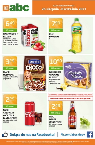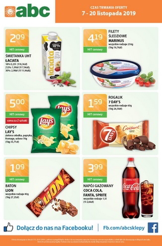 {loadposition linkABC} Nowa gazetka promocyjna sieci sklepów ABC. Polecane promocje z gazetki ABC: Śmietanka Łaciata 250 ml - 2,09 zł. Filety śledziowe Marinus 250 g - 4,19 zł. Baton Lion 40 g - 1,09 zł. Oferta…