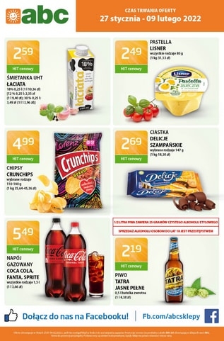 {loadposition linkABC} Nowa gazetka promocyjna sieci sklepów ABC. Polecane promocje z gazetki ABC: Śmietanka Łaciata 18% 250 ml - 2,59 zł. Pastella Lisner 80 g - 2,49 zł. Chipsy Crunchips 110 g - 4,99 zł. Oferta ważna…
