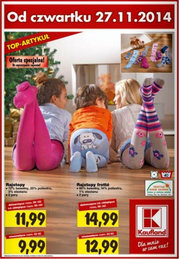 {loadposition linkKaufland} Nowa gazetka promocyjna marketu Kaufland - "TOP-artykuł". Polecane promocje z gazetki Kaufland: Rajstopy niemowlęce - 9,99 zł. Spodnie termiczne męskie - 14,99 zł. Śniegowce dziecięce - 34,99 zł. Oferta ważna od 27.11 do wyczerpania zapasów.