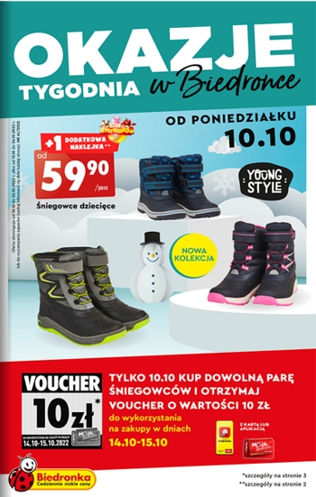 'Okazje tygodnia' - nowa gazetka promocyjna sieci sklepów Biedronka. Polecane promocje z gazetki sieci Biedronka: Śniegowce dziecięce Youngstyle - 44,99 zł. Kurtka młodzieżowa Youngstyle - 59,90 zł. Bluza dziecięca miś Bugs&Hugs - 29,99 zł. Oferta ważna…