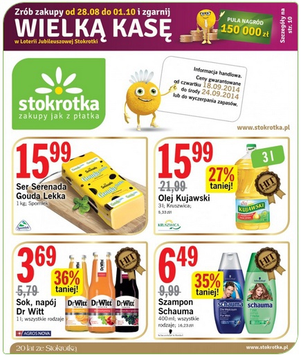 Nowa gazetka promocyjna sieci handlowej Stokrotka. Polecane promocje z gazetki Stokrotka: Ser Serenada Gouda Lekka 1 kg - 15,99 zł. Olej Kujawski 3 L - 15,99 zł. Sok Dr Witt 1 L - 3,69 zł. Oferta ważna…