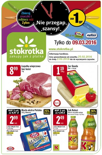 Nowa gazetka promocyjna sieci handlowej Stokrotka. Polecane promocje z gazetki Stokrotka: Łopatka wieprzowa bez kości 1 kg - 8,99 zł. Ser Gouda 100 g - 1,19 zł. Sok Kubuś 2x900 ml - 4,98 zł. Oferta ważna od…