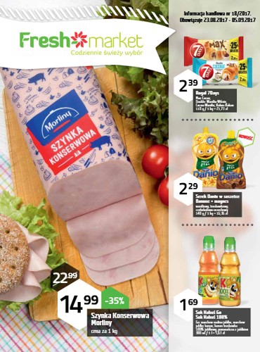 {loadposition linkFreshmarket} Nowa gazetka promocyjna sieci sklepów Freshmarket. Polecane promocje z gazetki Freshmarket: Szynka konserwowa Morliny 1 kg - 14,99 zł. Rogal 7Days 110 g - 2,39 zł. Sok Kubuś Go 300 ml - 1,69 zł.…