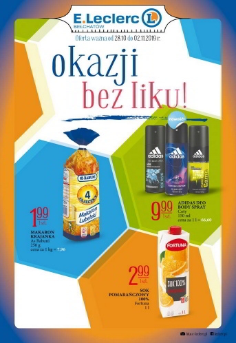 {loadposition linkEleclerc} 'Okazji bez liku!' - nowa gazetka promocyjna sieci handlowej E.Leclerc. Polecane promocje z gazetki E.Leclerc: Makaron Krajanka As Babuni 250 g - 1,99 zł. Sok pomarańczowy Fortuna 1 L- 2,99 zł. Dezodorant męski Adidas Deo Body…