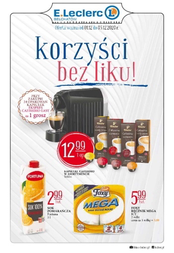 {loadposition linkEleclerc3} 'Korzyści bez liku!' - nowa gazetka promocyjna sieci handlowej E.Leclerc. Polecane promocje z gazetki E.Leclerc: Kapsułki Tchibo Cafissimo - 12,99 zł*. Sok pomarańczowy Fortuna 1 L - 2,99 zł. Ręcznik papierowy Foxy Mega 2 rolki - 5,99…