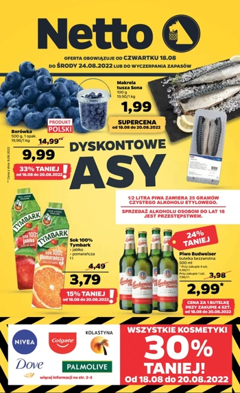 {loadposition linkNetto} 'Dyskontowe asy' - nowa gazetka promocyjna sieci sklepów Netto. Polecane promocje z gazetki Netto: Borówka 500 g - 8,99 zł*. Makrela tusza Sona 100 g - 1,99 zł*. Sok Tymbark 1 l - 3,79 zł*. *…