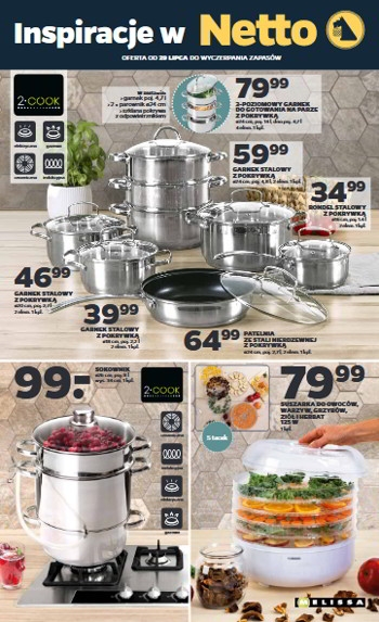 {loadposition linkNetto} Nowa gazetka promocyjna sieci sklepów Netto. Polecane promocje z gazetki Netto: 3-poziomowy garnek do gotowania na parze z pokrywką - 79,99 zł. Sokownik 2 Cook - 99 zł. Suszarka do owoców, warzyw, grzybów, ziół i herbat…