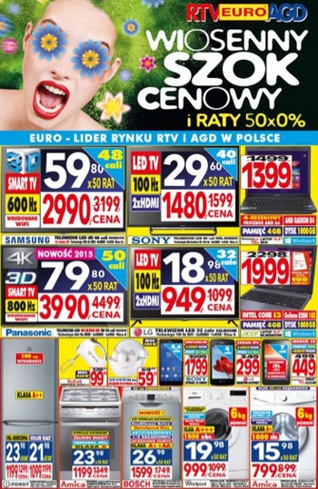 Nowa gazetka promocyjna RTV EURO AGD - "Wiosenny szok cenowy i raty 50x0%!". Polecane promocje z gazetki RTV EURO AGD: Telewizor LED 3D 48" Samsung UE48H6700 - 2990 zł. Telewizor LED 40" Sony KDL-40R450B - 1480 zł. Pralka…
