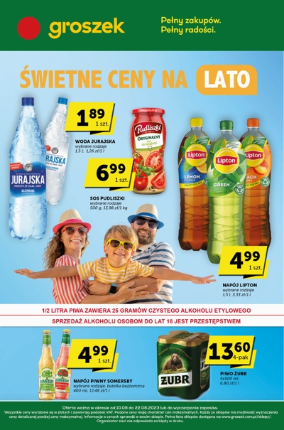 {loadposition linkGroszek} 'Świetne ceny na lato' - nowa gazetka promocyjna sieci sklepów Groszek. Polecane promocje z gazetki Groszek: Woda Jurajska 1,5 L - 1,89 zł. Sos Pudliszki 500 g - 6,99 zł. Napój Lipton 1,5 L - 4,99 zł.…