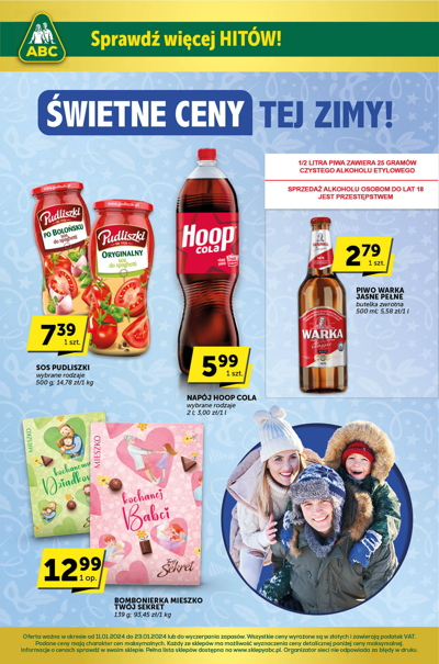 {loadposition linkABC} 'Świetne ceny tej zimy' - nowa gazetka promocyjna sieci sklepów ABC. Polecane promocje z gazetki ABC: Sos Pudliszki 500 g - 7,39 zł. Napój Hoop Cola 2 L - 5,99 zł. Piwo Warka Jasne Pełne 500 ml…