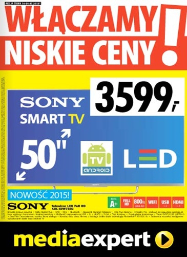 {loadposition linkMediaExpert} Nowa gazetka promocyjna Media Expert - "Włączamy niskie ceny!". Polecane promocje z gazetki Media Expert: Telewizor LED 50" SONY KDL-50W756C - 3699 zł. Smartfon SAMSUNG GALAXY TREND 2 LITE - 299 zł. Soundbar SONY HT-CT380 - 1299…