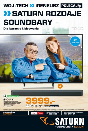 {loadposition linkMediaMarkt} 'Saturn rozdaje soundbary dla lepszego kibicowania' - nowa gazetka promocyjna Saturn. Polecane promocje z gazetki Saturn: Telewizor 4K Ultra HD 55 cali SONY KD-55XE8505 + Soundbar SONY HTSF150.CEL - 3999 zł. Telewizor 4K Ultra HD LG 55UJ6307 +…
