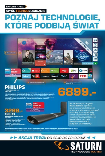 {loadposition linkMediaMarkt} Nowa gazetka promocyjna Saturn - "Poznaj technologie, które podbiją świat". Polecane promocje z gazetki Saturn: Telewizor 4k Ultra HD 55" PHILIPS 55PUS7600/12 - 6899 zł Soundbar PHILIPS Fidelio B5/12 - 3299 zł Wielofunkcyjny robot kuchenny z funkcją…