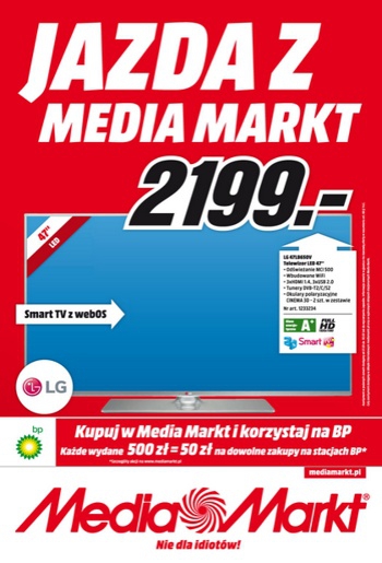 {loadposition linkMediaMarkt} Nowa gazetka promocyjna Media Markt - "Jazda z Media Markt". Polecane promocje z gazetki Media Markt: Telewizor LED 47" LG 47LB650V - 2199 zł. Telewizor LED 32" SAMSUNG UE32H5000AW - 999 zł. Soundbar PHILIPS HTL3142S - 899…