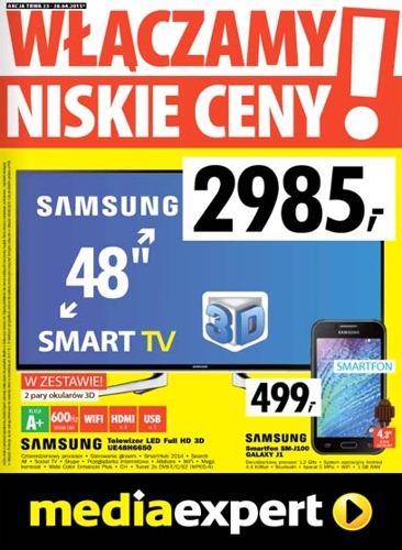 {loadposition linkMediaExpert} Nowa gazetka promocyjna Media Expert - "Włączamy niskie ceny!". Polecane promocje z gazetki Media Expert: Telewizor LED 3D 48" SAMSUNG UE48H6650 - 2985 zł. Smartfon SAMSUNG GALAXY J1 SM-J100 - 499 zł. Soundbar SONY HT-CT370 - 909,30…