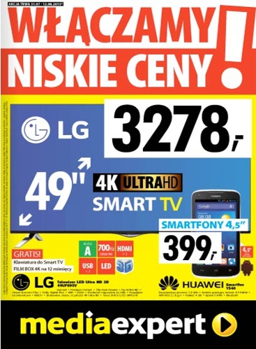 {loadposition linkMediaExpert} Nowa gazetka promocyjna Media Expert - "Włączamy niskie ceny!". Polecane promocje z gazetki Media Expert: Telewizor 4K Ultra HD 3D 49" LG 49UF695V - 3278 zł. Smartfon HUAWEI Y540 - 399 zł. Soundbar PANASONIC SC-HTB485 - 999…