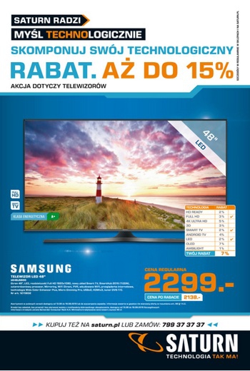 {loadposition linkMediaMarkt} Nowa gazetka promocyjna Saturn - "Skomponuj swój technologiczny rabat. Aż do 15%". Polecane promocje z gazetki Saturn: Telewizor LED 48" SAMSUNG UE48J5600 - 2299 zł Telewizor LED 32" LG 32LF632V - 1549 zł. Soundbar LG LAS350B -…