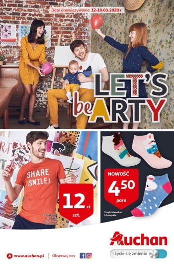 {loadposition linkAuchan} 'Let's be arty' - nowa gazetka promocyjna sieci marketów Auchan. Polecane promocje z gazetki Auchan: T-shirt męski z napisami - 12 zł. Stopki damskie lub męskie - 4,50 zł. Spódnica damska - 30 zł. …