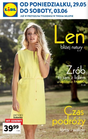 {loadposition linkLidl} Nowa gazetka promocyjna Lidl. Polecane promocje z gazetki Lidl: Sukienka damska z lnem Esmara - 39,99 zł. Spodnie damskie z lnem Esmara - 11,99 zł. Koszula damska z lnem Esmara - 22,99 zł. Oferta ważna od…