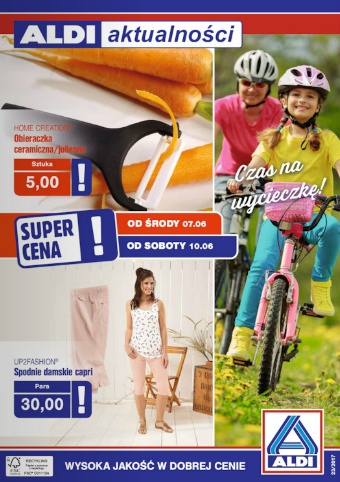 {loadposition linkAldi} Nowa gazetka promocyjna Aldi - "Czas na wycieczkę". Polecane promocje z gazetki Aldi: Obieraczka ceramiczna Julienne - 5 zł. Spodnie damskie capri Up2Fashion - 30 zł. Składany rower alumionowy 20" - 999 zł. Oferta ważna…