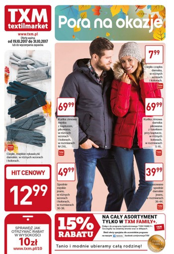 {loadposition linkTXM} Nowa gazetka promocyjna Textil Market - "Pora na okazje". Polecane promocje z gazetki Textil Market: Kurtka zimowa damska lub męska - 69,99 zł. Dopasowane spodnie damskie jeans - 39,99 zł. Ciepła czapka damska -…