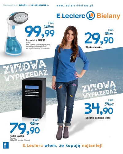 {loadposition linkEleclerc} Nowa gazetka promocyjna sieci handlowej E.Leclerc - "Wyprzedaż zimowa". Polecane promocje z gazetki E.Leclerc: Parownica MPM MZP01 - 99,99 zł. Radio Denver DAB56 - 79,90 zł. Spodnie damskie jeans - 34,90 zł. Oferta ważna od…