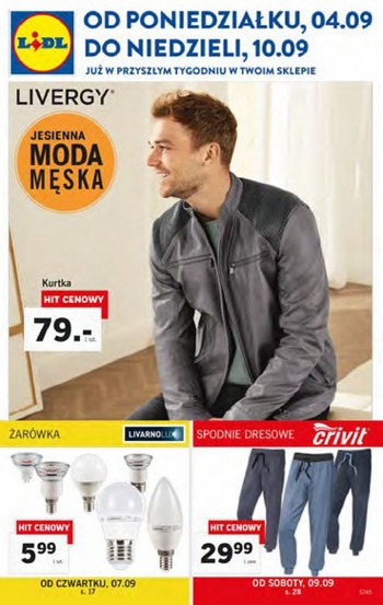 {loadposition linkLidl} Nowa gazetka promocyjna sieci sklepów Lidl - "Jesienna moda męska". Polecane promocje z gazetki sklepów Lidl: Kurtka męska Livergy - 79 zł. Spodnie dresowe Crivit - 29,99 zł. Jeansy męskie Livergy - 37,99 zł.…
